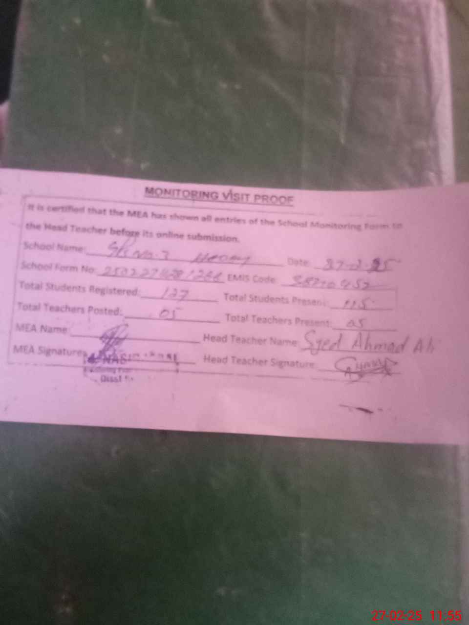 | Attendance Register | Head Teacher | MEA with School | Visit Proof |