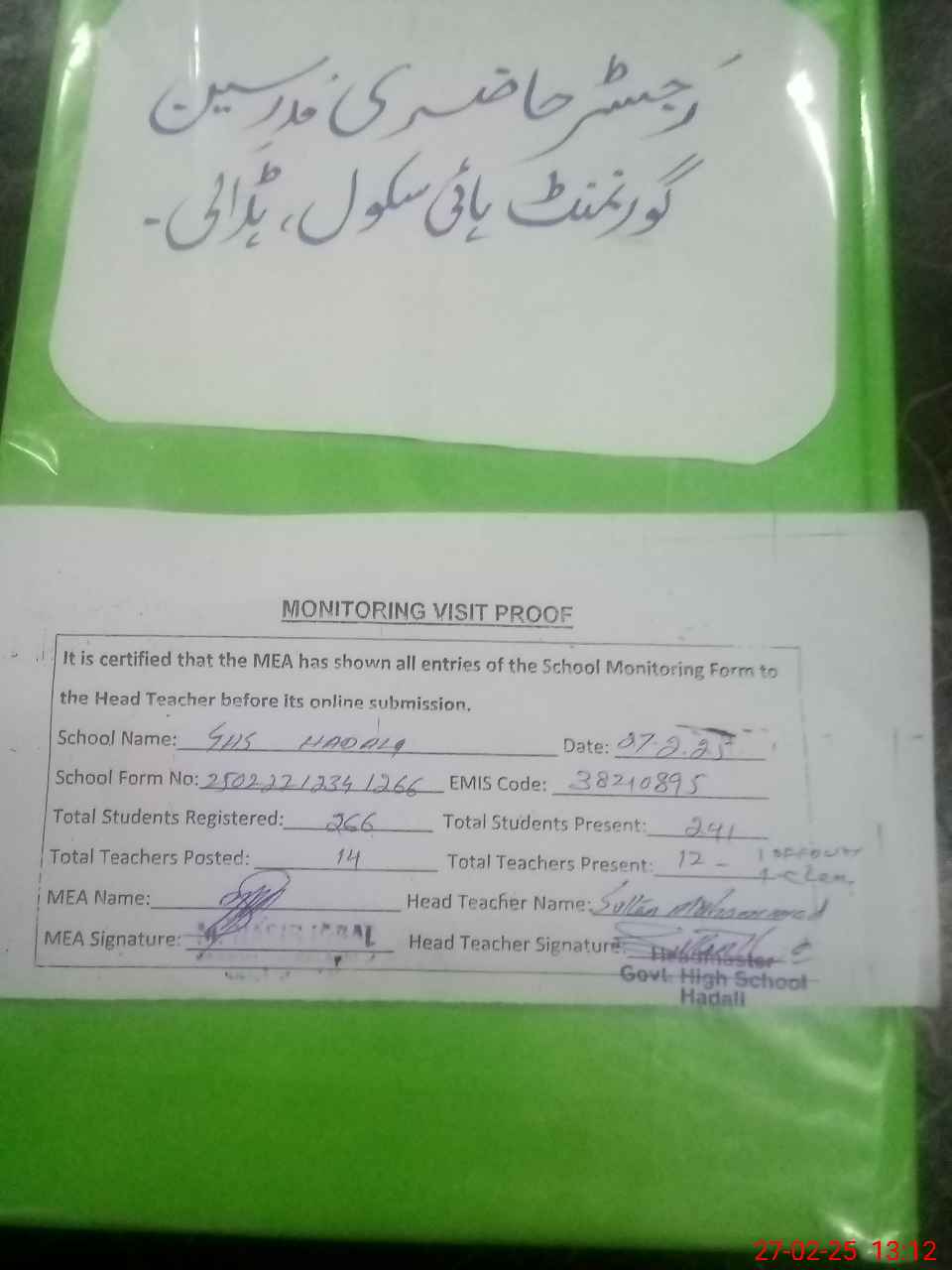 | Attendance Register | Head Teacher | MEA with School | Visit Proof |