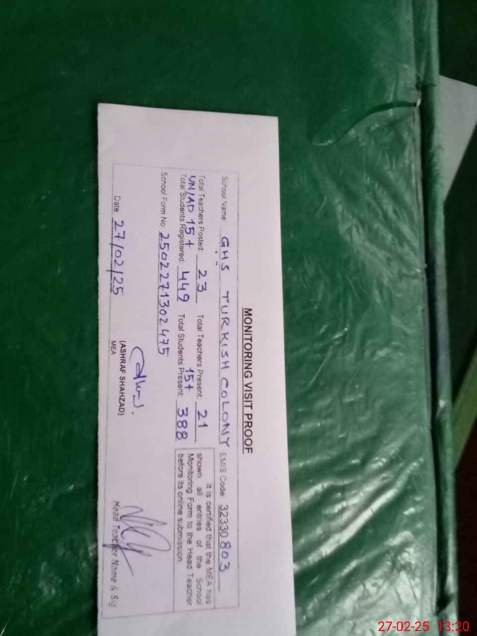 | Attendance Register | Head Teacher | MEA with School | Visit Proof |