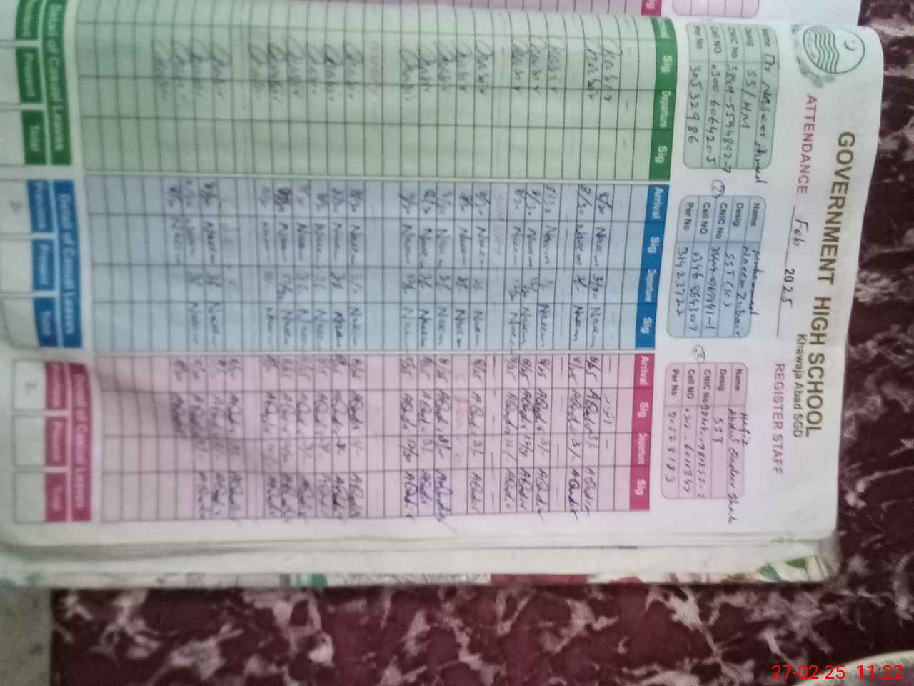 | CNIC | Full Name | Designation | R/C | Absence during last cal. month |