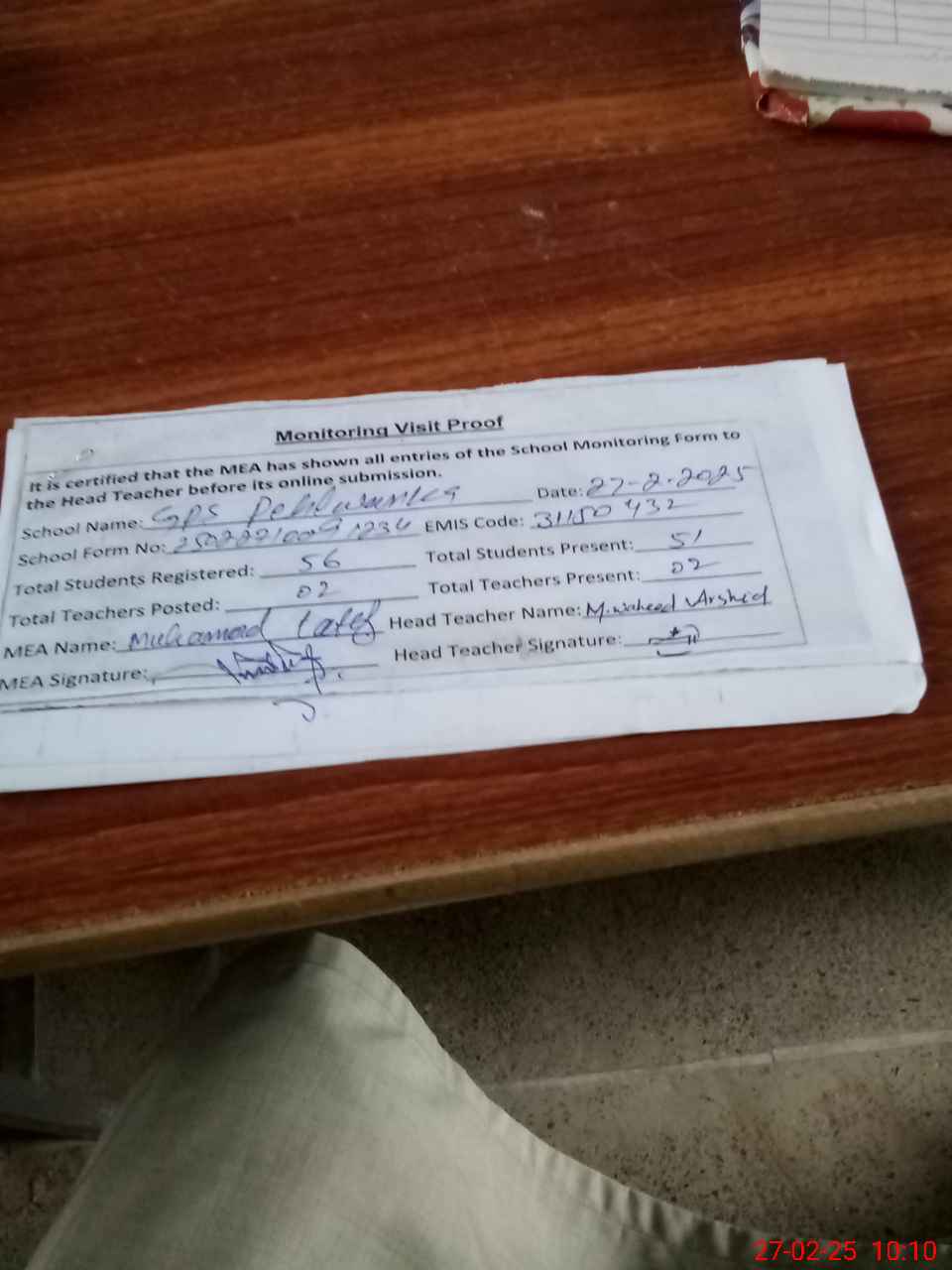 | Attendance Register | Head Teacher | MEA with School | Visit Proof |
