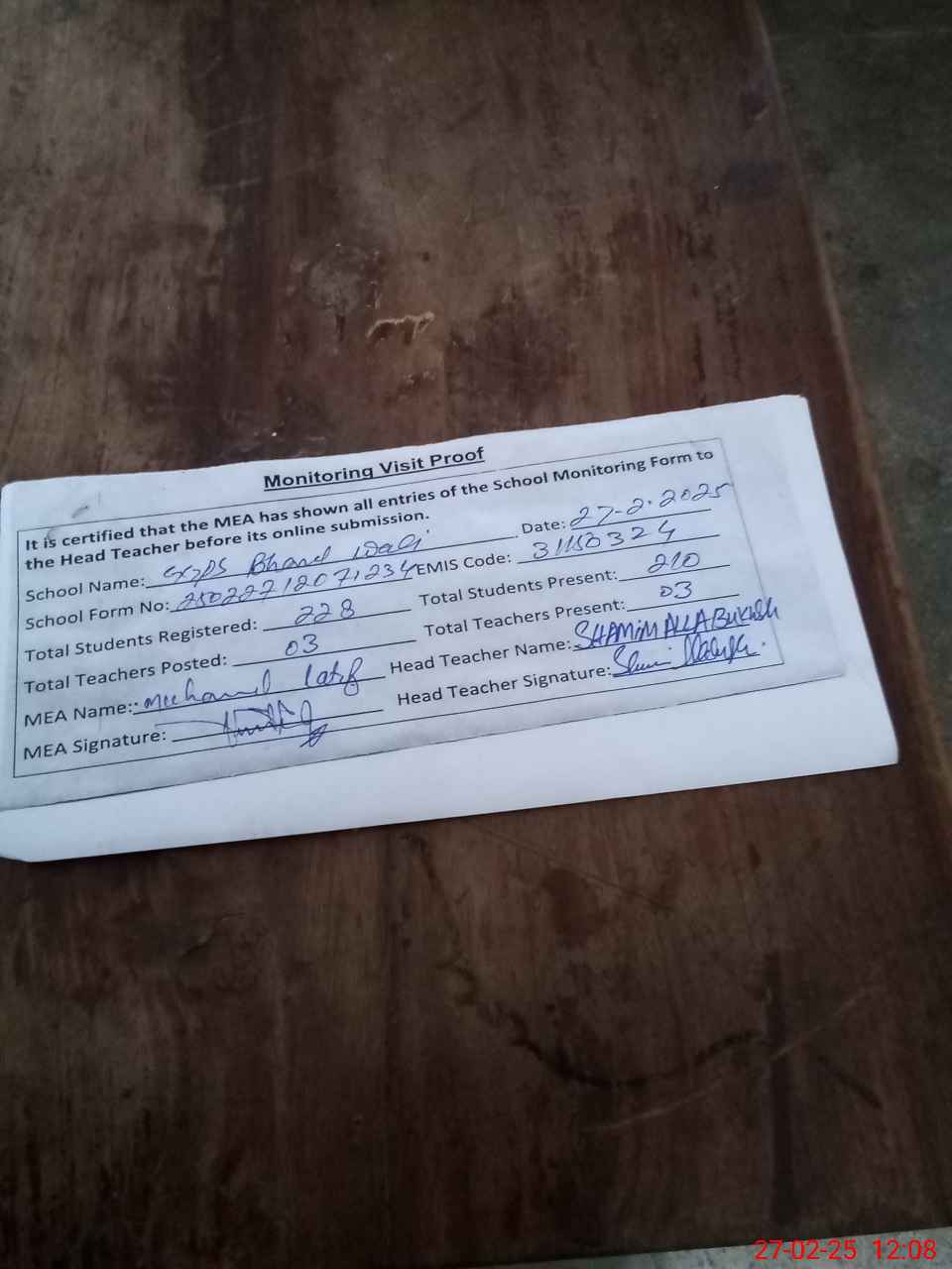 | EMIS Code: 31150324 | Name of School: GGPS BHAND WALI | |||