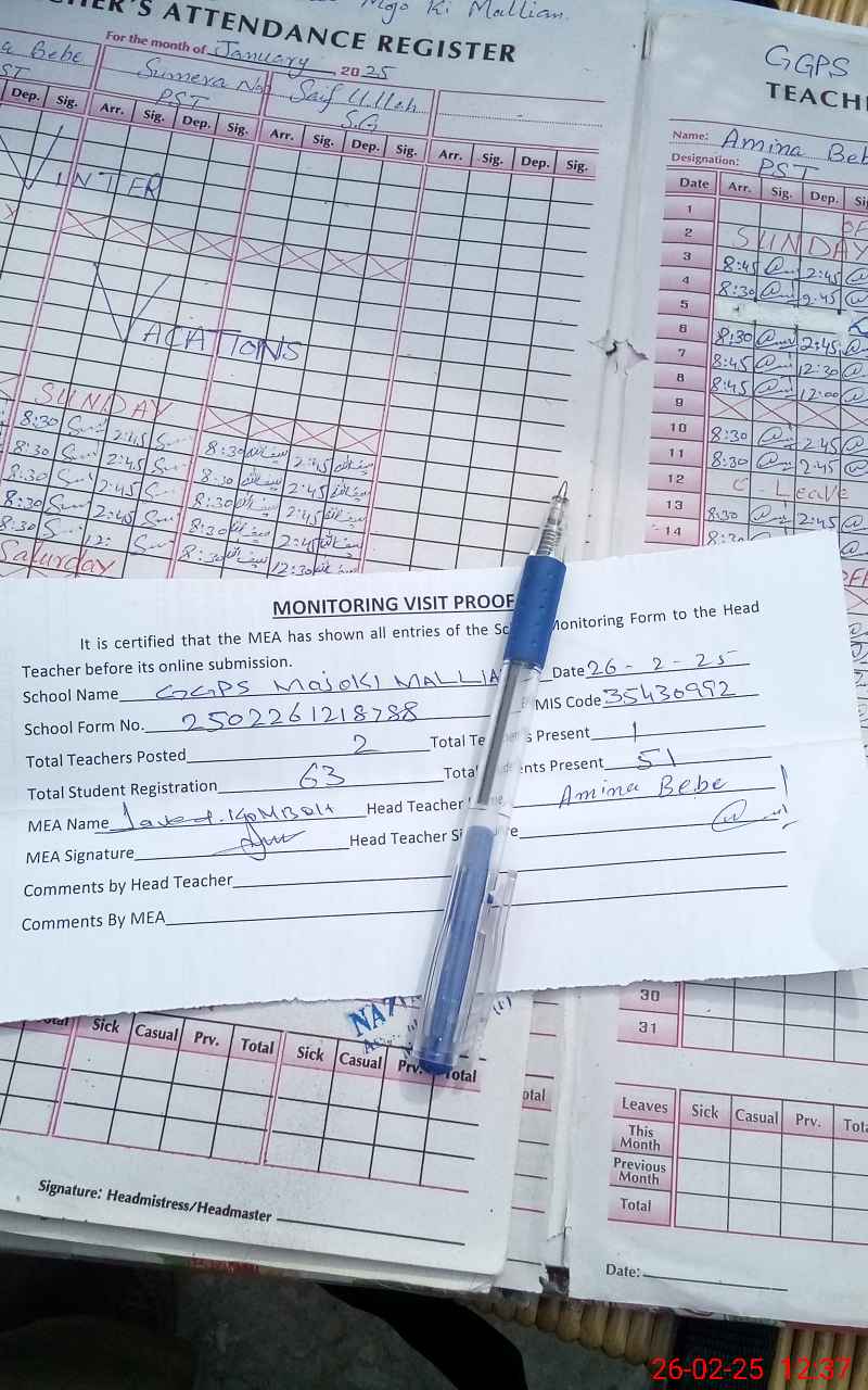 | Attendance Register | Head Teacher | MEA with School | Visit Proof |