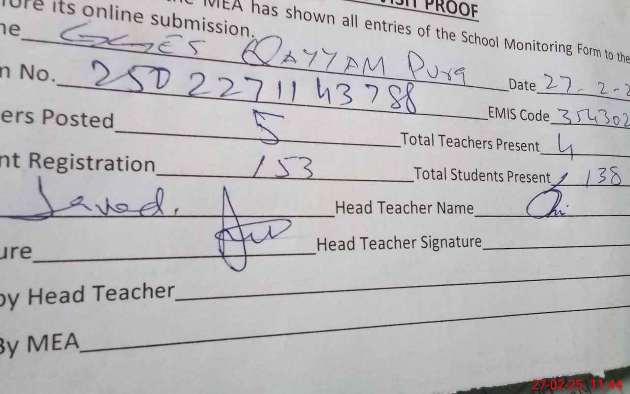 | Attendance Register | Head Teacher | MEA with School | Visit Proof |