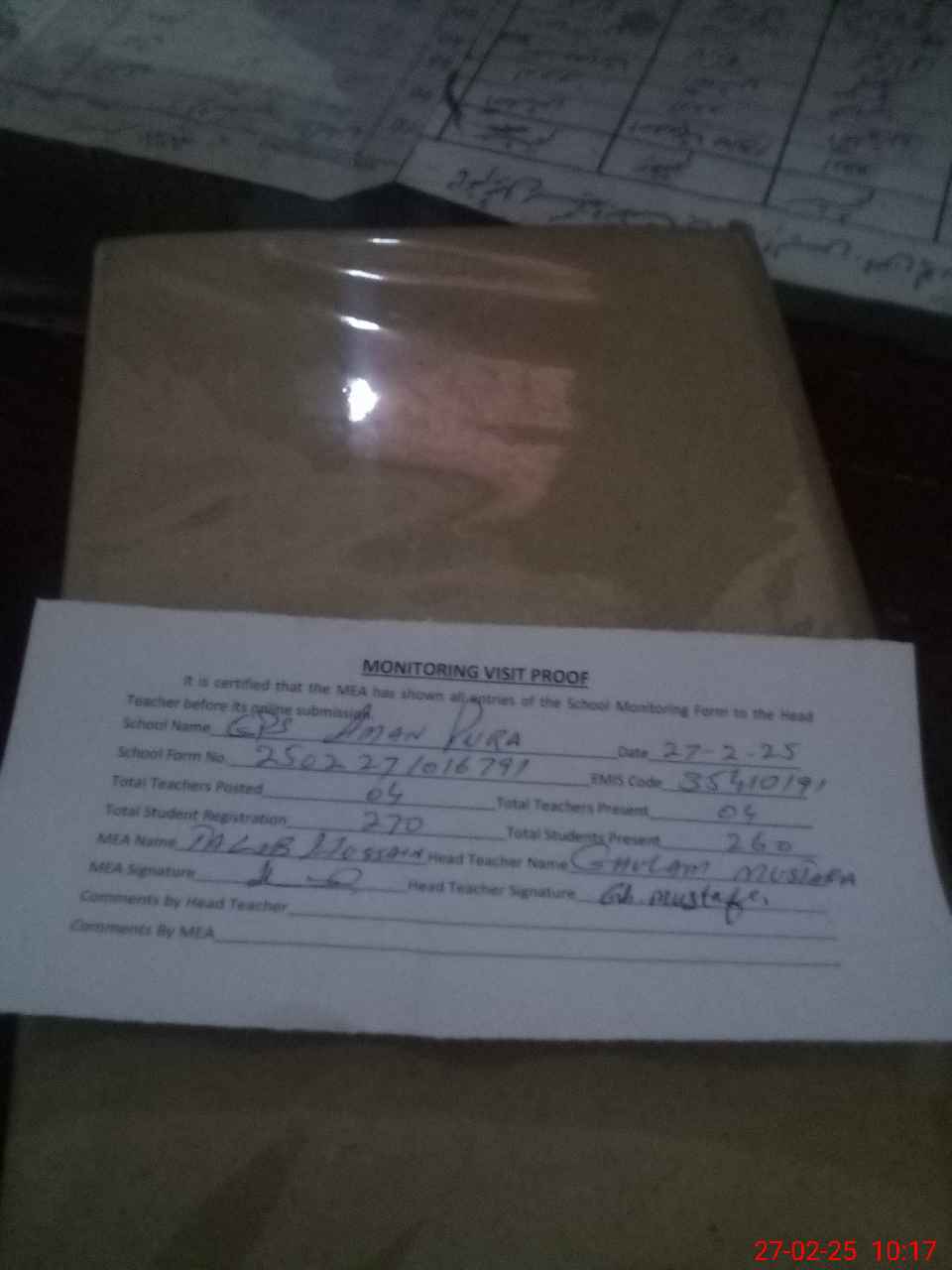 | Attendance Register | Head Teacher | MEA with School | Visit Proof |