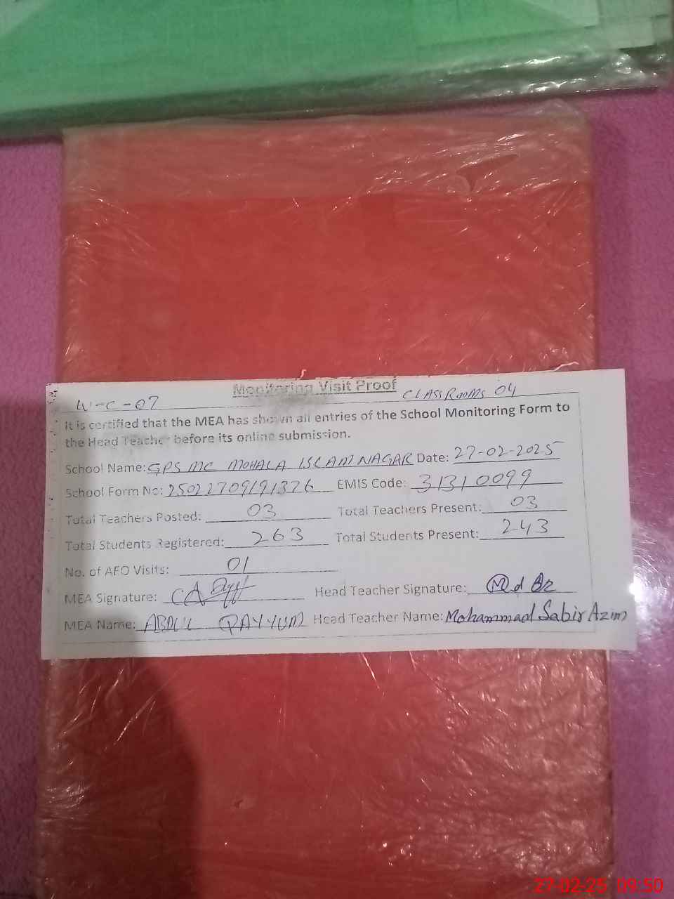 | EMIS Code: 31310099 | Name of School: GPS MC ARBIA MODDIB MOHALLA ISLAM NAGAR | |||