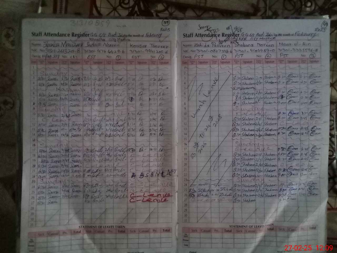 | CNIC | Full Name | Designation | R/C | Absence During Last Calender Month |