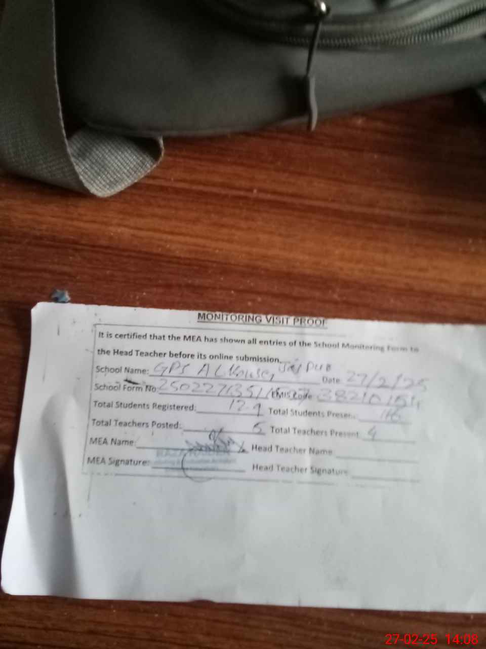 | Attendance Register | Head Teacher | MEA with School | Visit Proof |