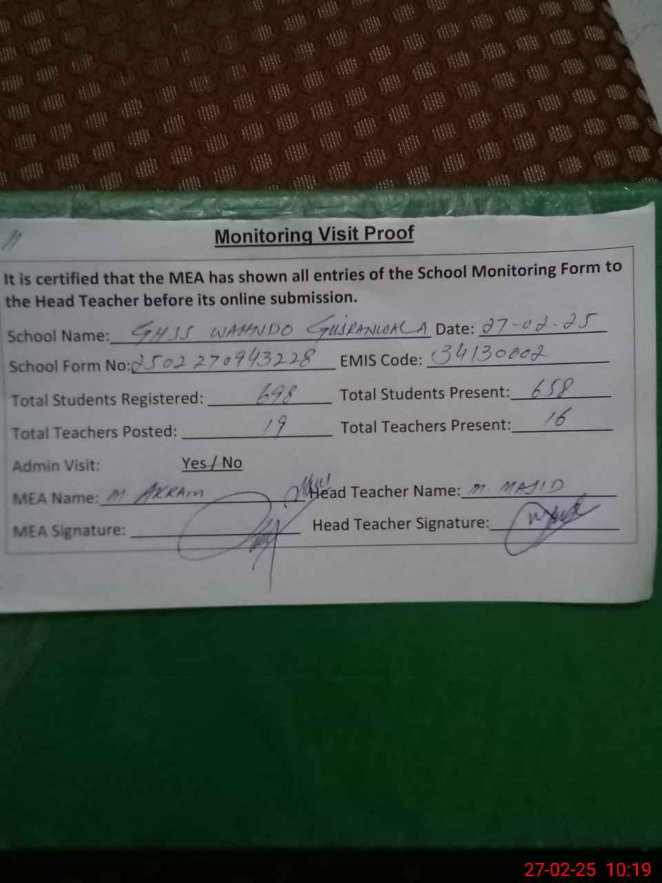 | EMIS Code: 34130002 | Name of School: GHSS WAHNDO GUJRANWALA | |||
