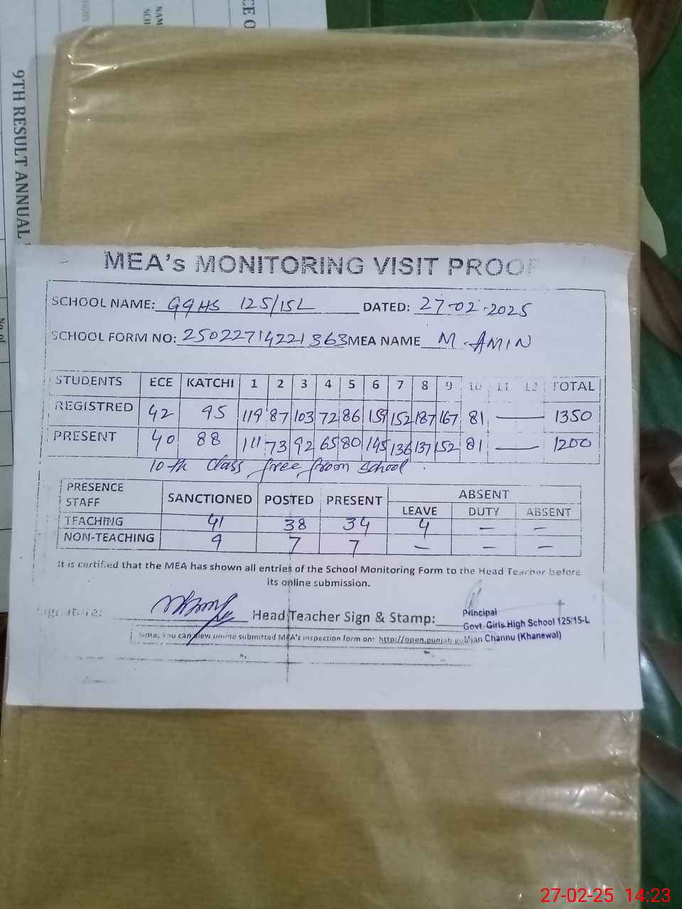 | Attendance Register | Head Teacher | MEA with School | Visit Proof |