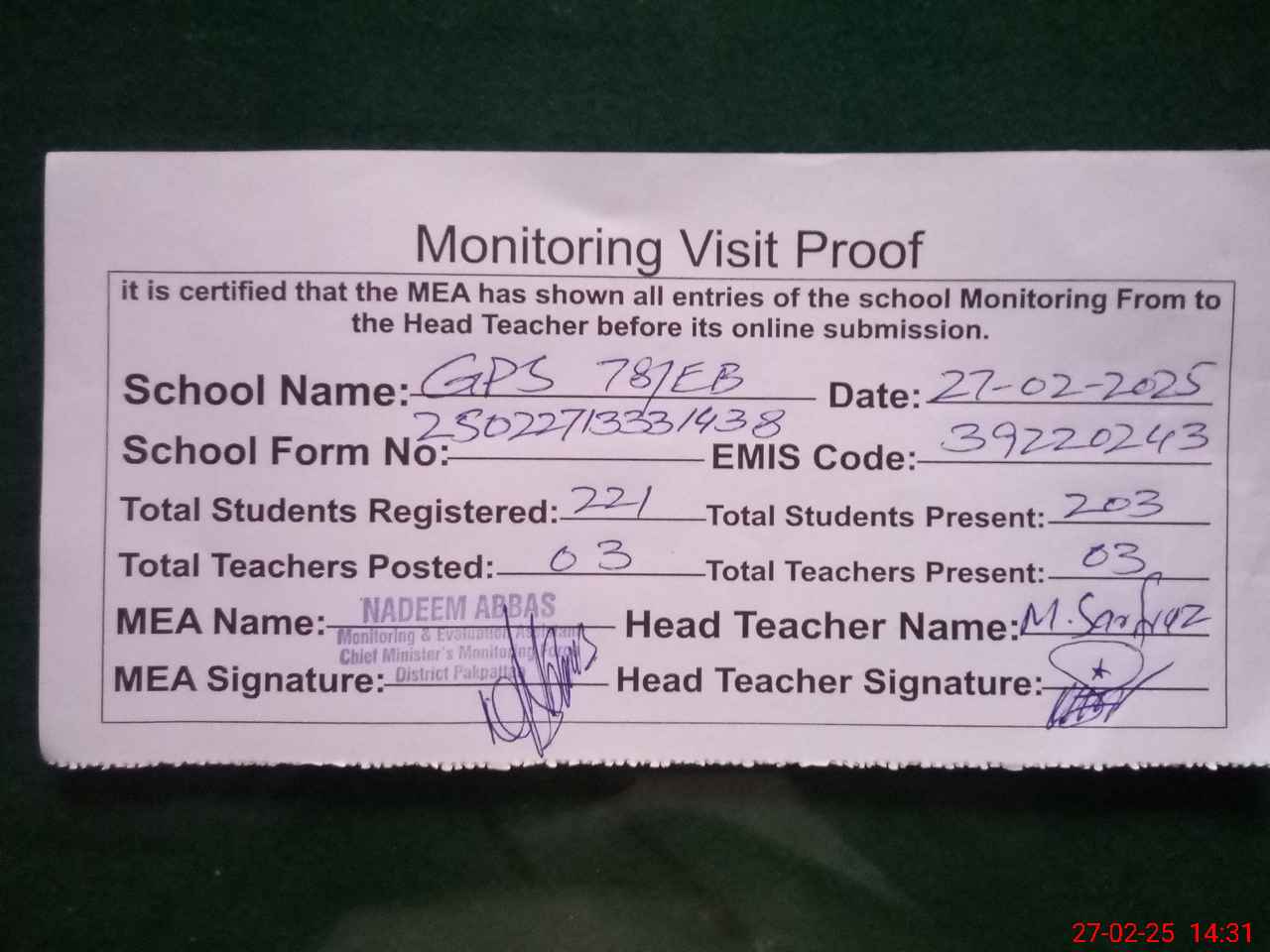 | Attendance Register | Head Teacher | MEA with School | Visit Proof |