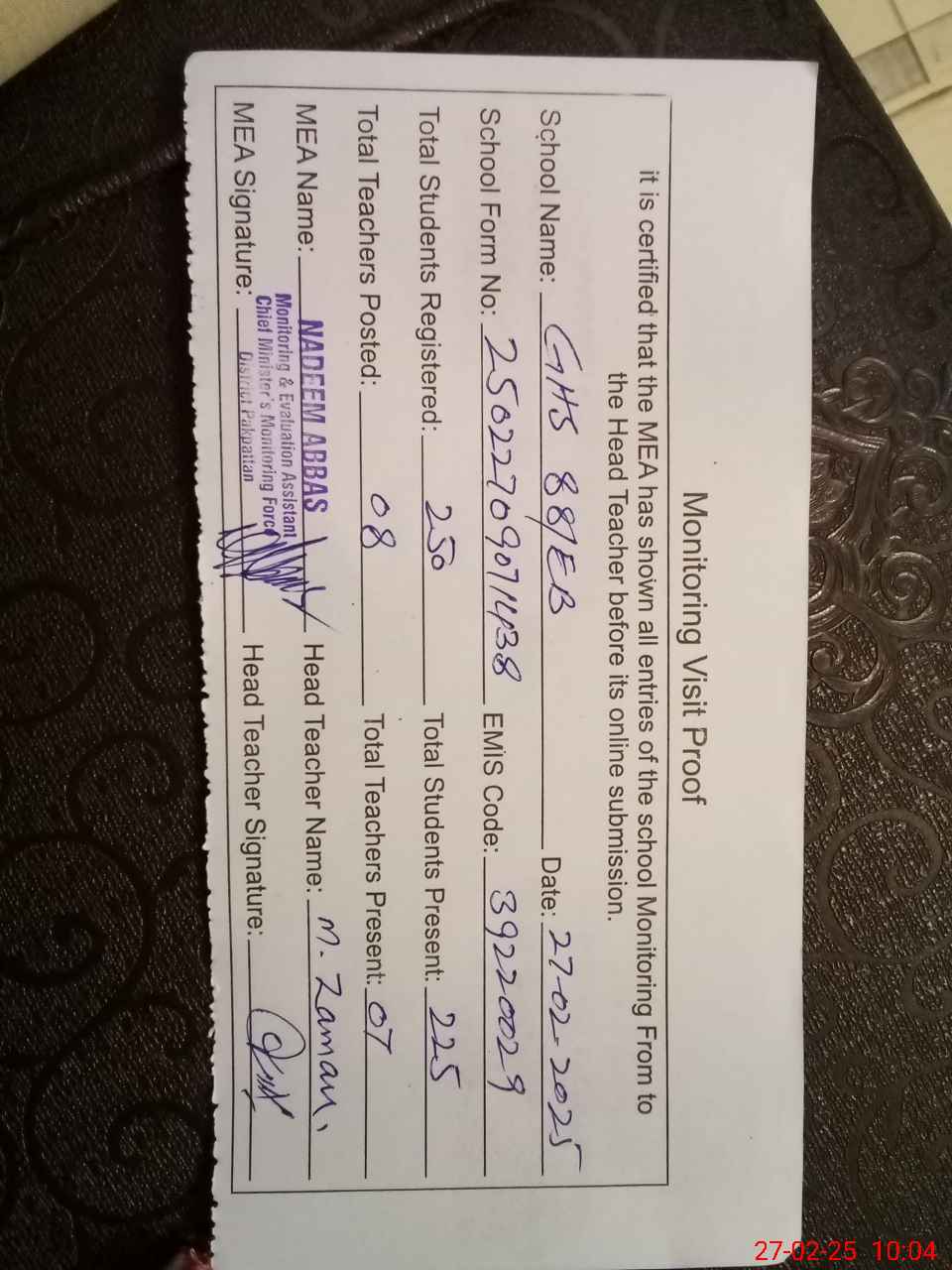 | Attendance Register | Head Teacher | MEA with School | Visit Proof |