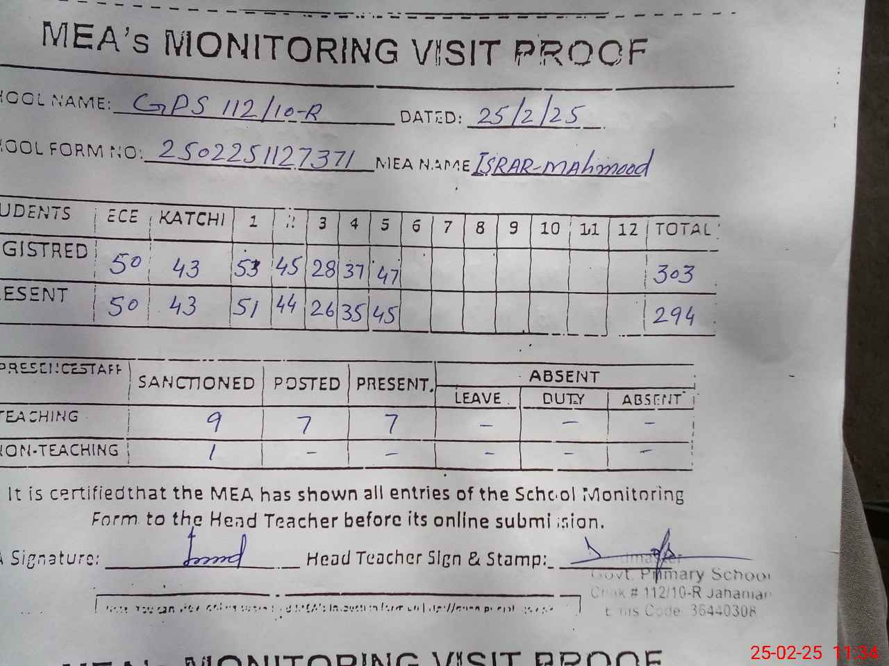 | Attendance Register | Head Teacher | MEA with School | Visit Proof |