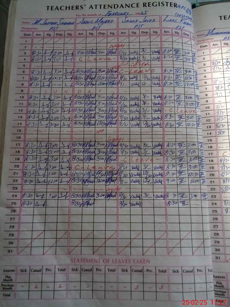 | CNIC | Full Name | Designation | R/C | Absence During Last Calender Month |