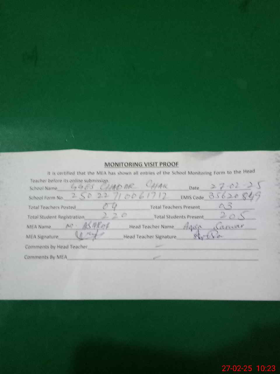 | EMIS Code: 35620849 | Name of School: GGES CHADAR CHAK | |||