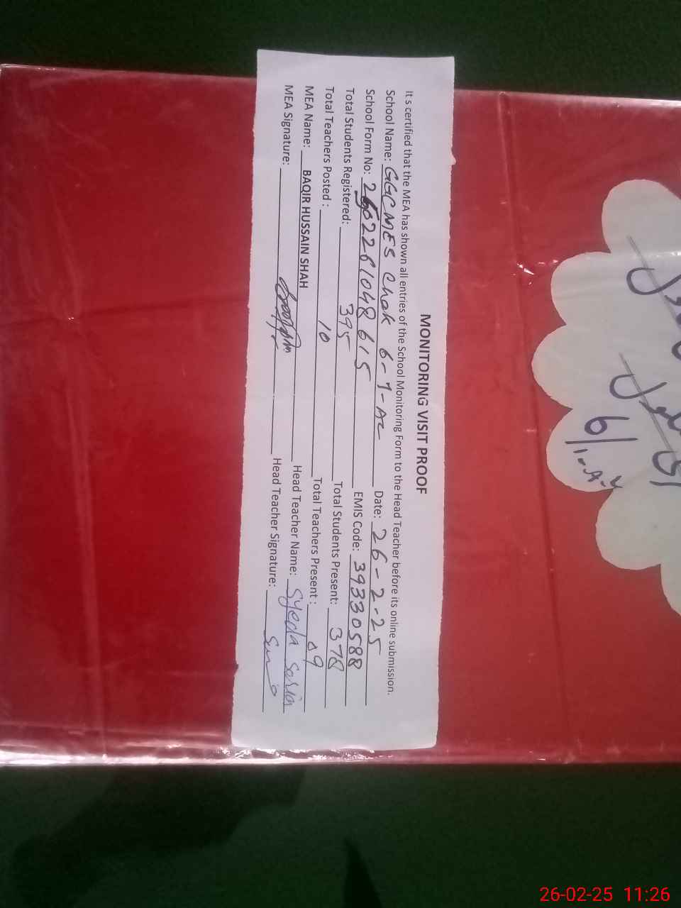 | Attendance Register | Head Teacher | MEA with School | Visit Proof |