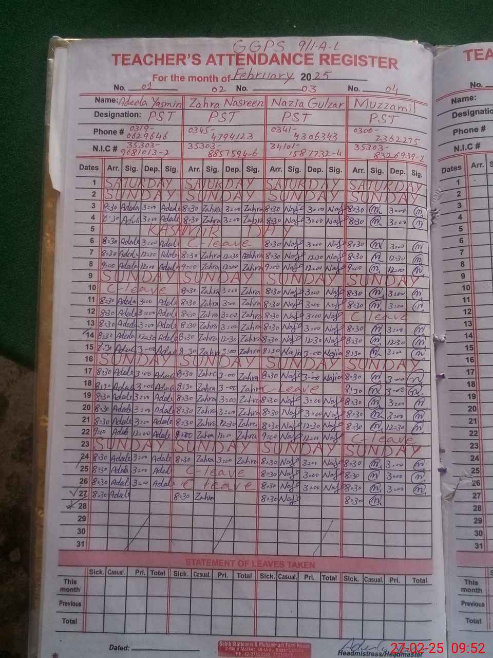 | CNIC | Full Name | Designation | R/C | Absence During Last Calender Month |