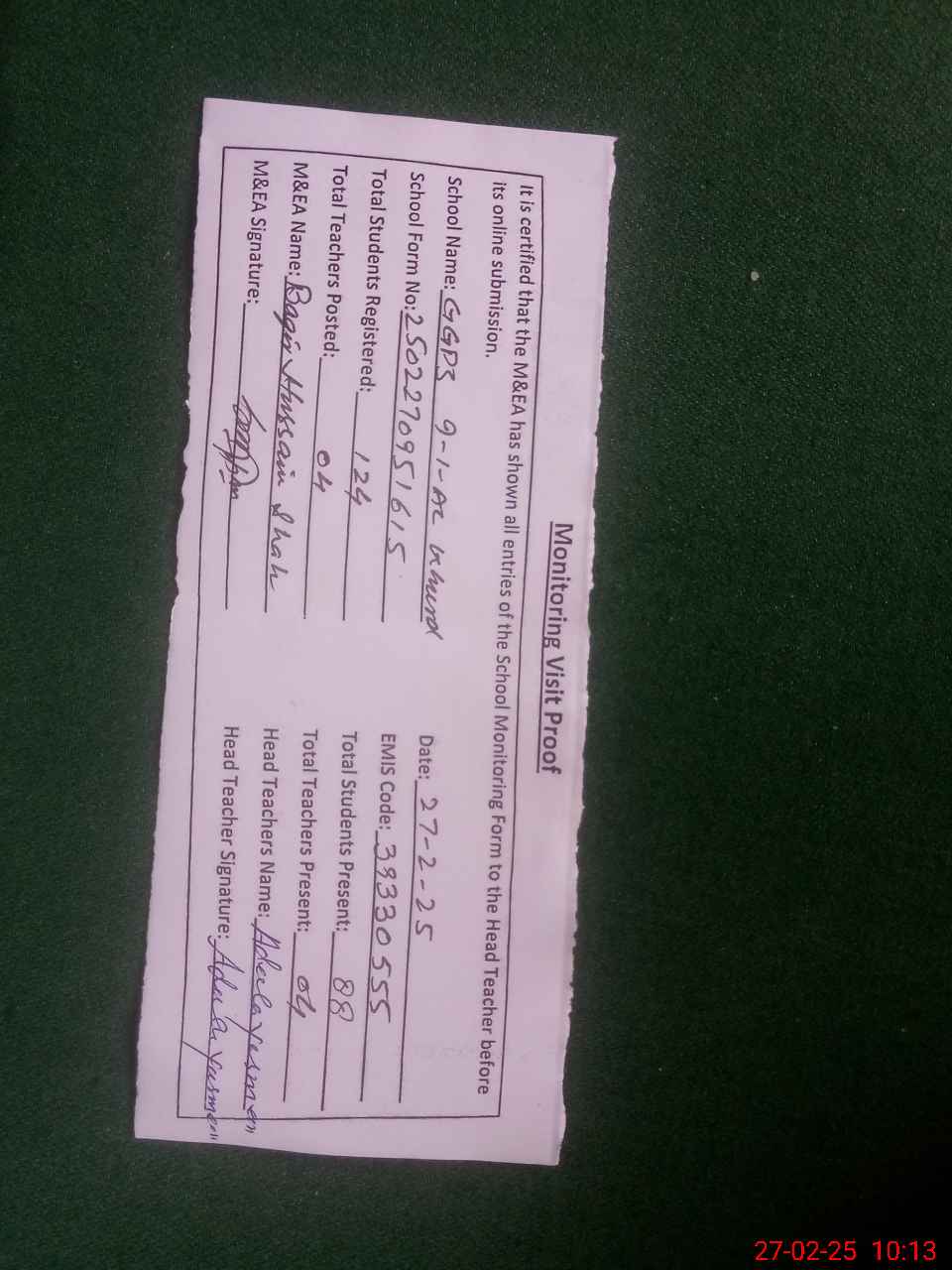 | Attendance Register | Head Teacher | MEA with School | Visit Proof |
