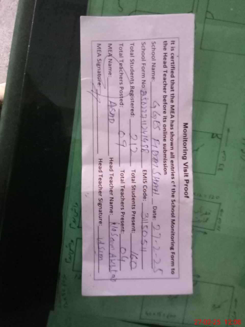 | Attendance Register | Head Teacher | MEA with School | Visit Proof |