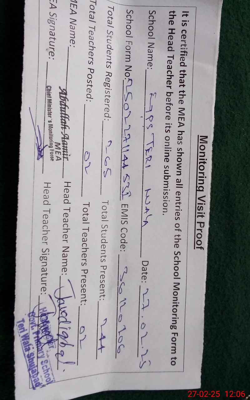 | EMIS Code: 36120106 | Name of School: GPS TERI WALA VILLAGE GANWEN SHUJABAD | |||