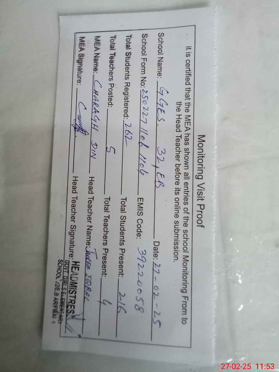 | Attendance Register | Head Teacher | MEA with School | Visit Proof |