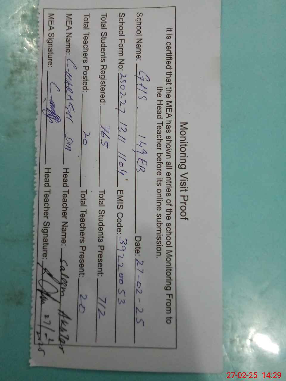 | EMIS Code: 39220053 | Name of School: GHS 149 EB ARIF WALA | |||