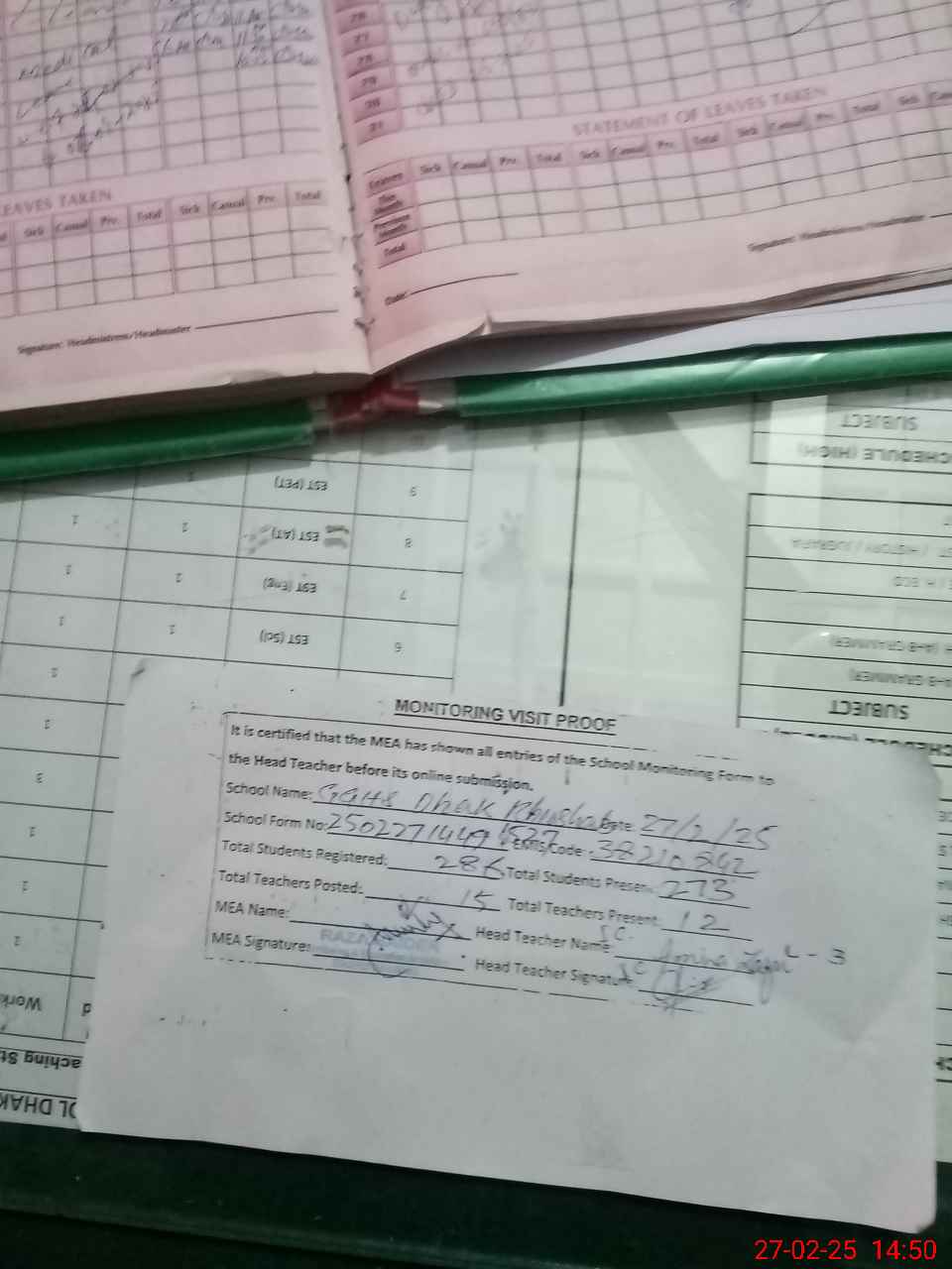 | Attendance Register | Head Teacher | MEA with School | Visit Proof |