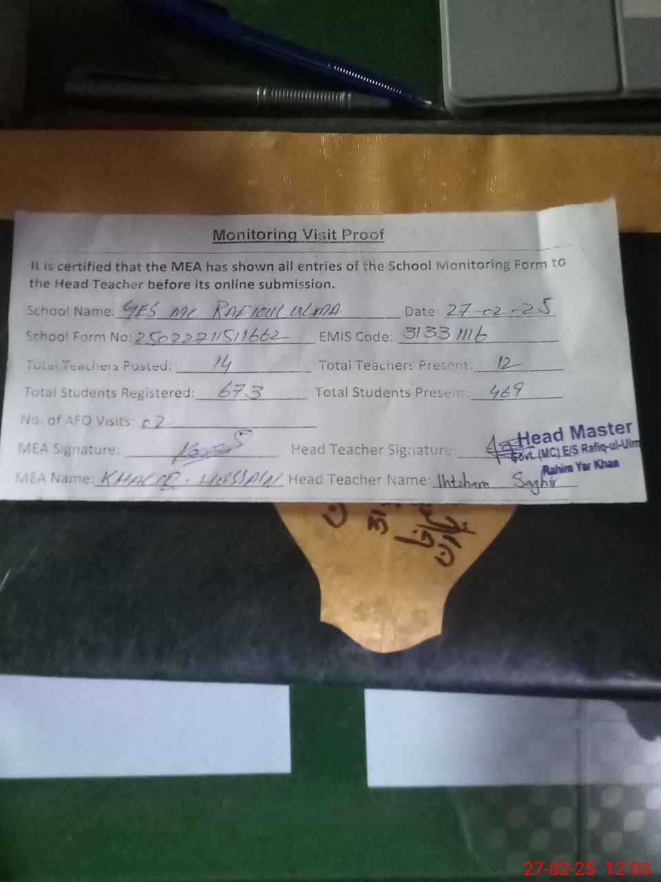 | Attendance Register | Head Teacher | MEA with School | Visit Proof |