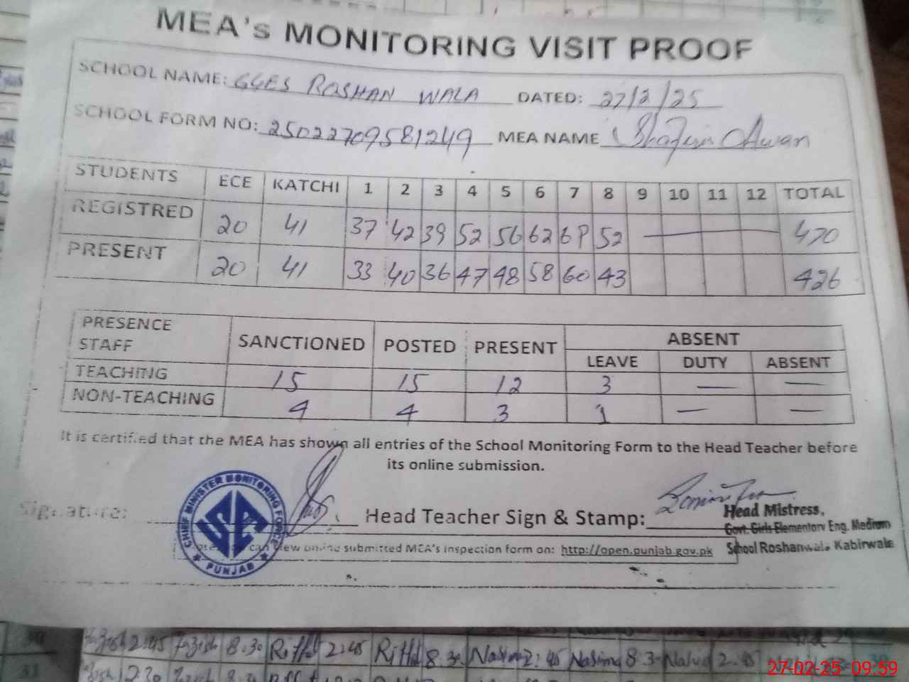 | Attendance Register | Head Teacher | MEA with School | Visit Proof |