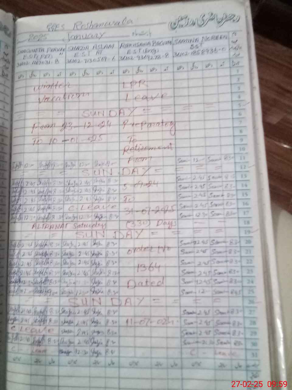 | 38**** | Na**** Pa**** | PST | Regular | 2 | 0 | 0 | 0 | 0 | 0 | 0 | 0 | 2 | Casual |