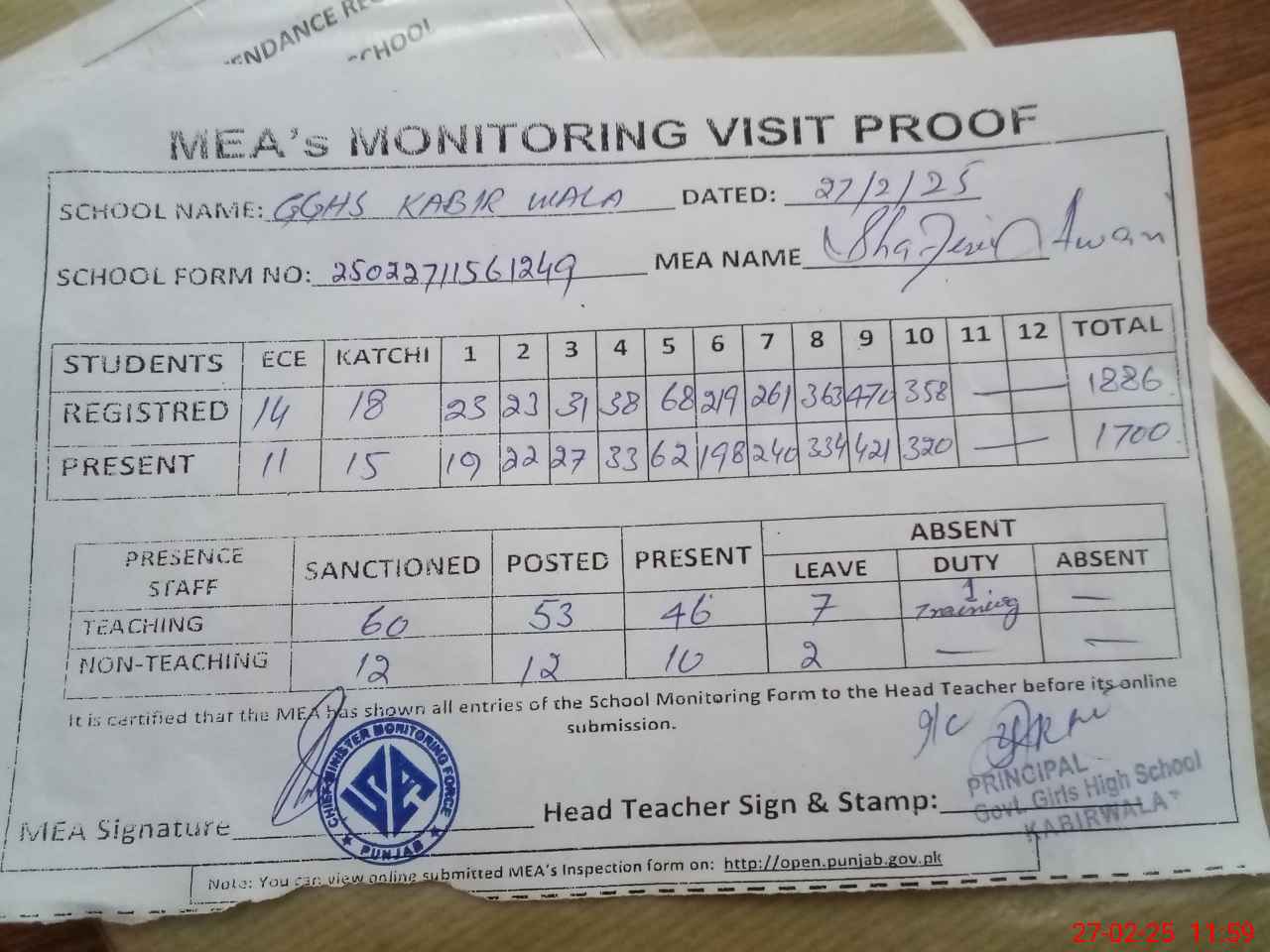 | EMIS Code: 36410030 | Name of School: GGHS KABIRWALA, KUTCHERY BAZAR, KABIRWALA | |||
