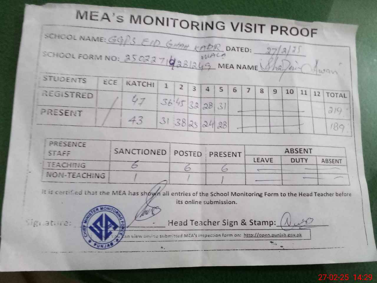 | EMIS Code: 36410336 | Name of School: GGPS EID GHAH, KABIRWALA | |||