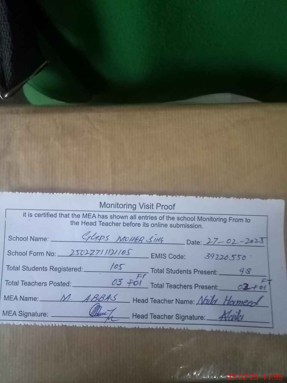 | Attendance Register | Head Teacher | MEA with School | Visit Proof |