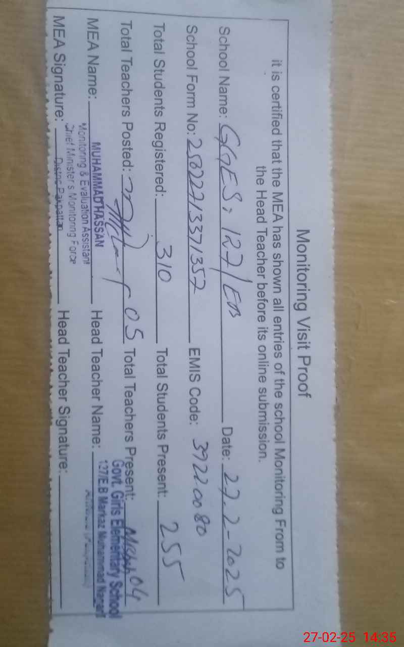 | Attendance Register | Head Teacher | MEA with School | Visit Proof |