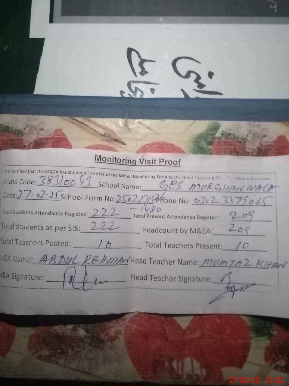 | Certified that this School was Inspected by the Undersigned MEA/DMO Today and the Information Stated Above is as Per Record. | |||||