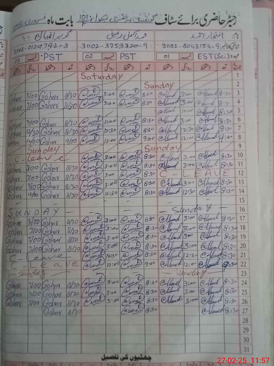 | CNIC | Full Name | Designation | R/C | Absence During Last Calender Month |
