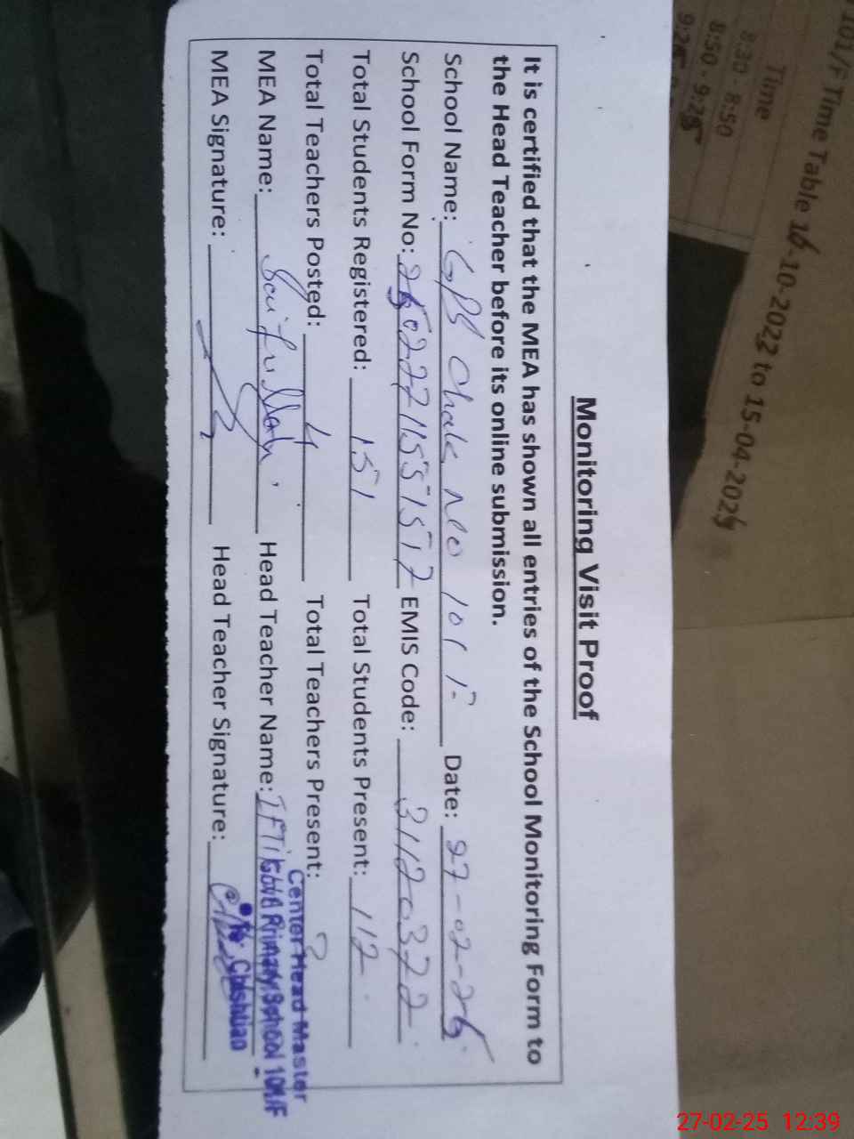 | Attendance Register | Head Teacher | MEA with School | Visit Proof |