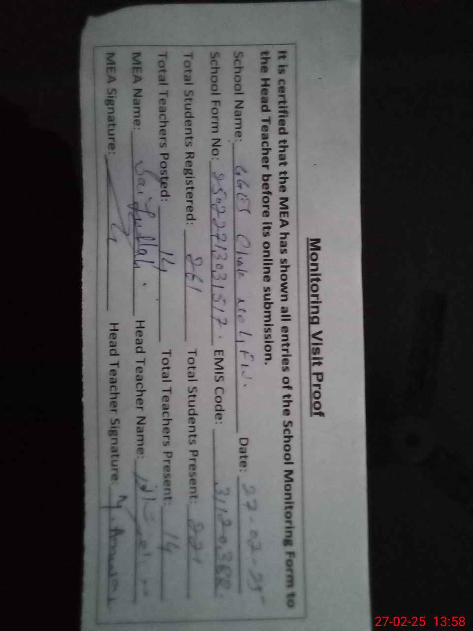 | Certified that this School was Inspected by the Undersigned MEA/DMO Today and the Information Stated Above is as Per Record. | |||||