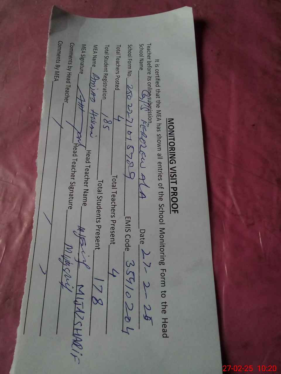| Attendance Register | Head Teacher | MEA with School | Visit Proof |