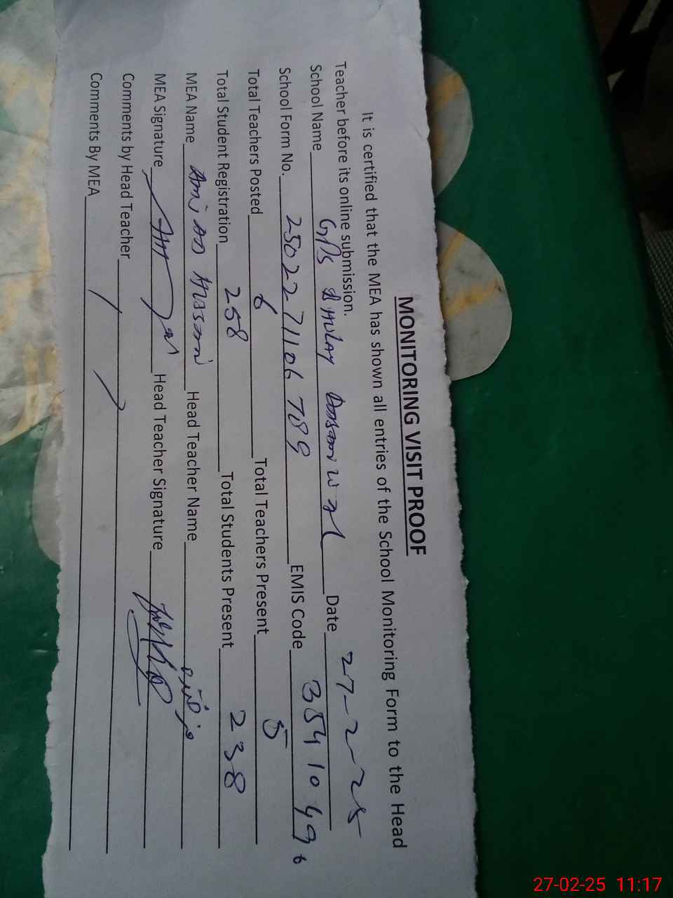 | Attendance Register | Head Teacher | MEA with School | Visit Proof |
