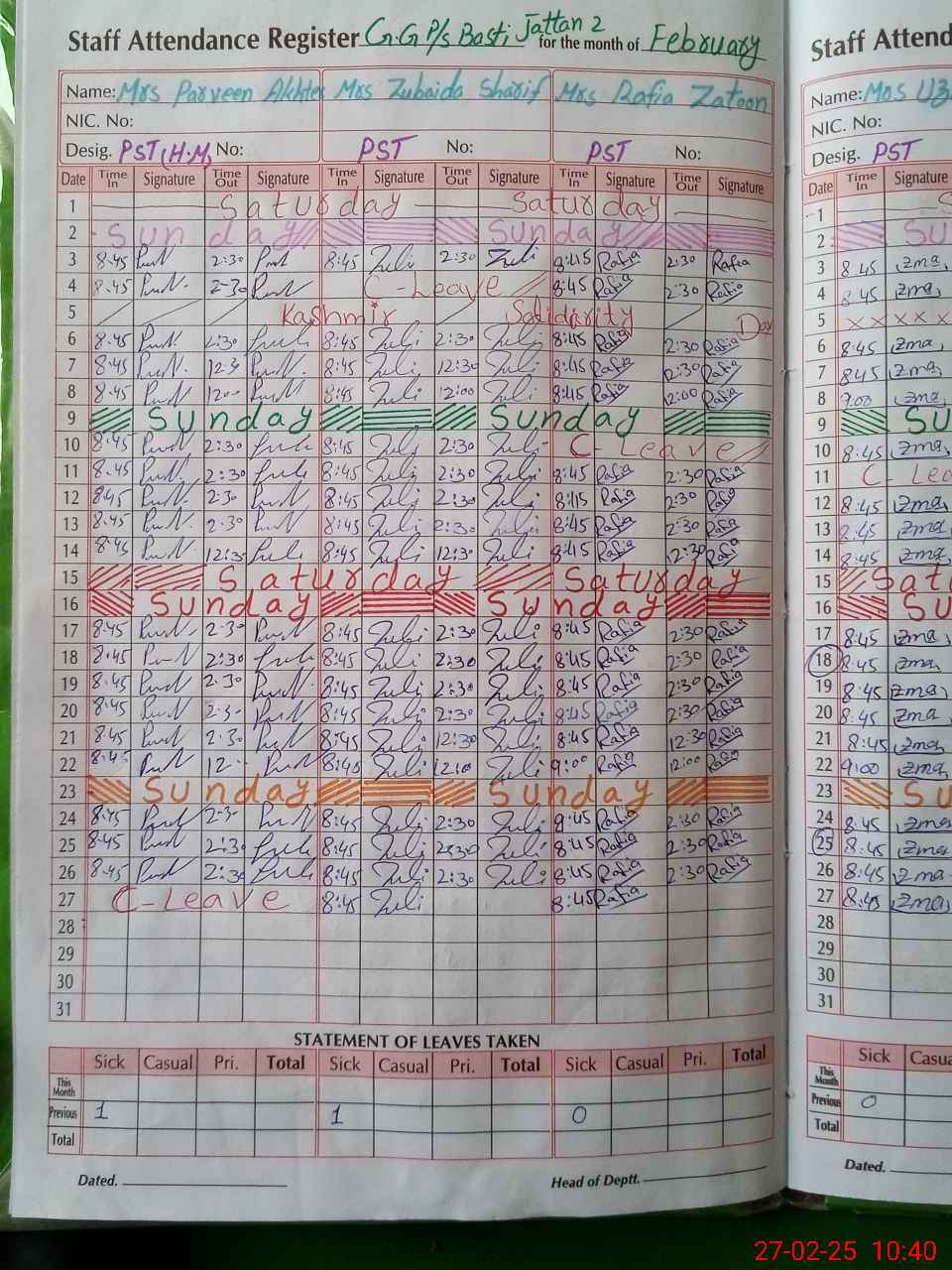 | Leave | Duty | Absent | Maternity | Medical | Ex- Pak |