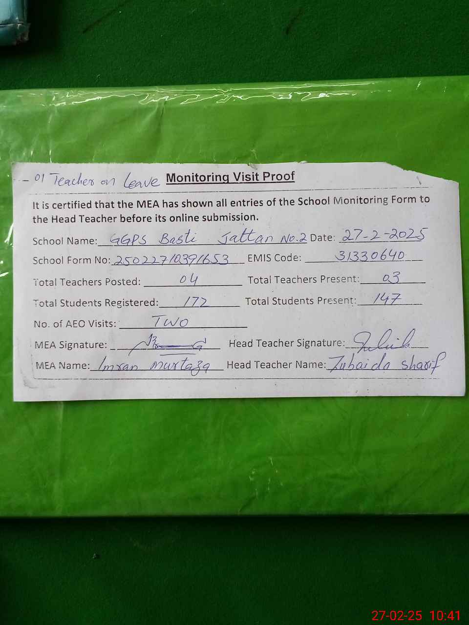 | Attendance Register | Head Teacher | MEA with School | Visit Proof |