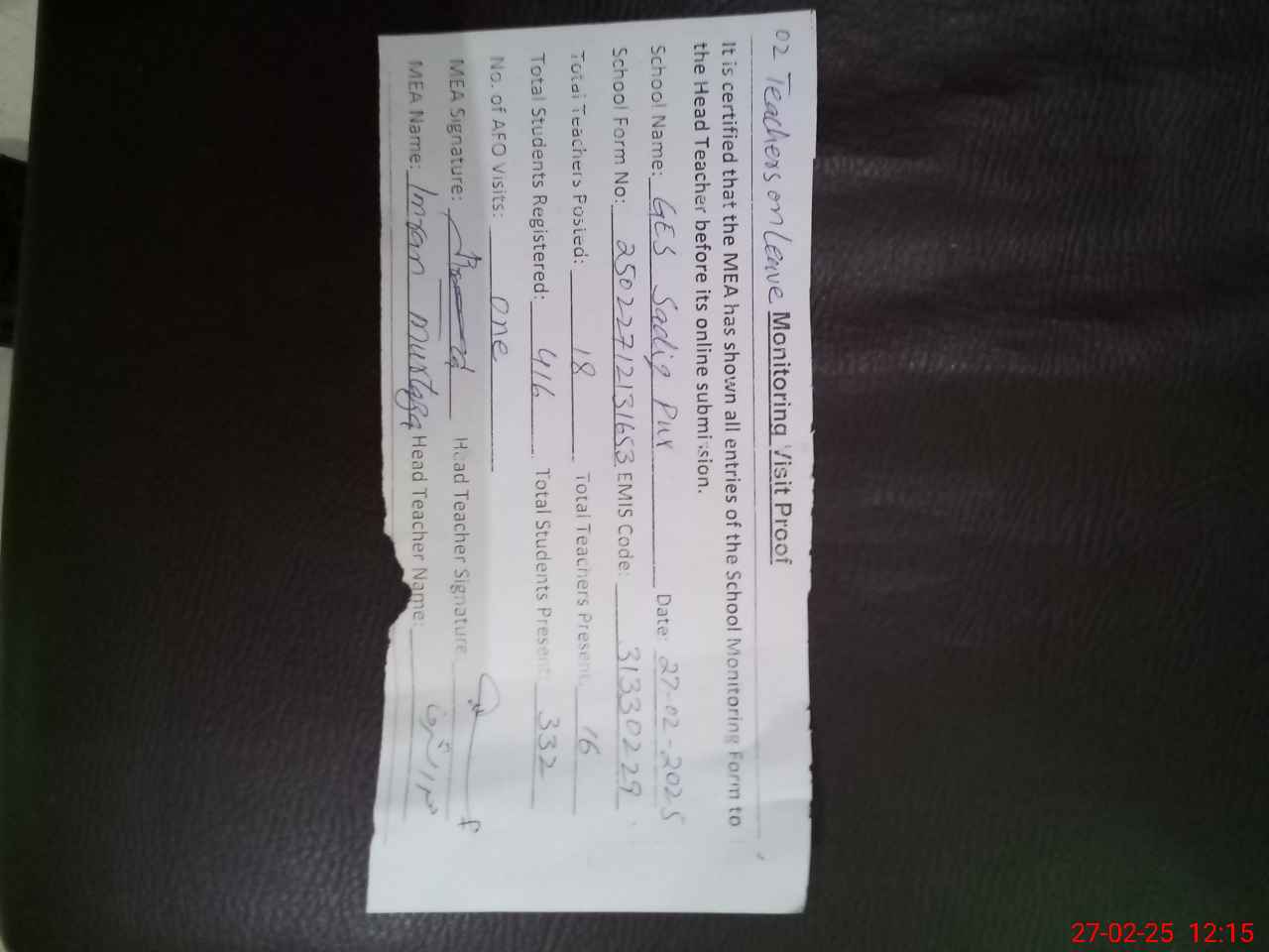 | Attendance Register | Head Teacher | MEA with School | Visit Proof |