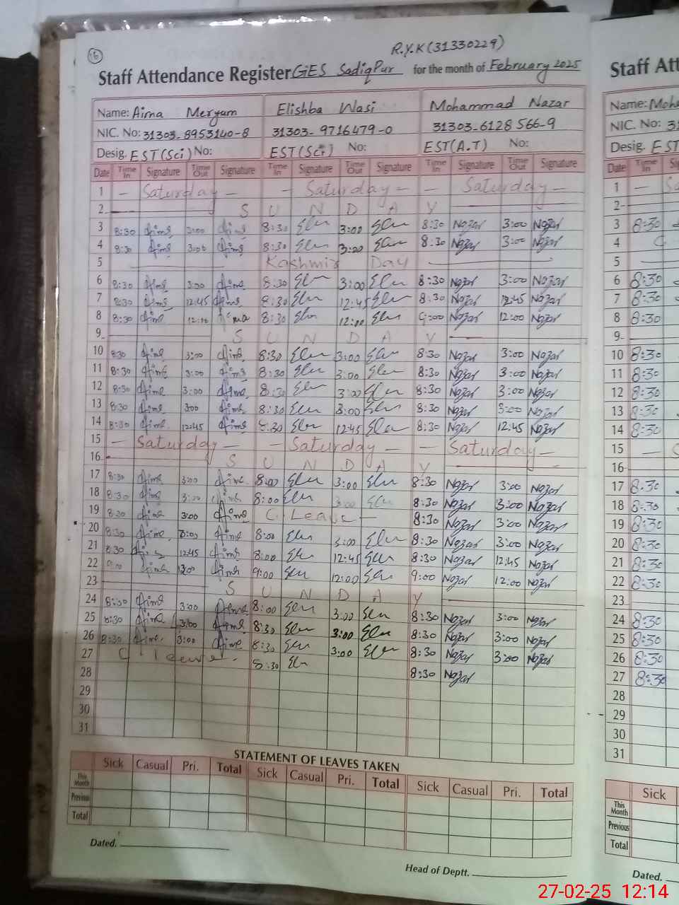 | CNIC | Full Name | Designation | R/C | Absence During Last Calender Month |