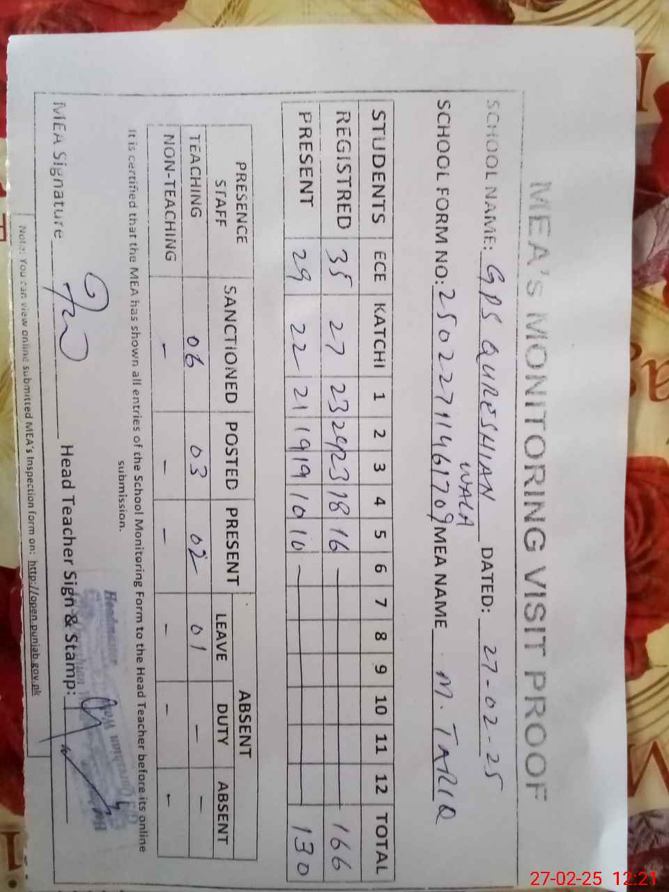 | Attendance Register | Head Teacher | MEA with School | Visit Proof |