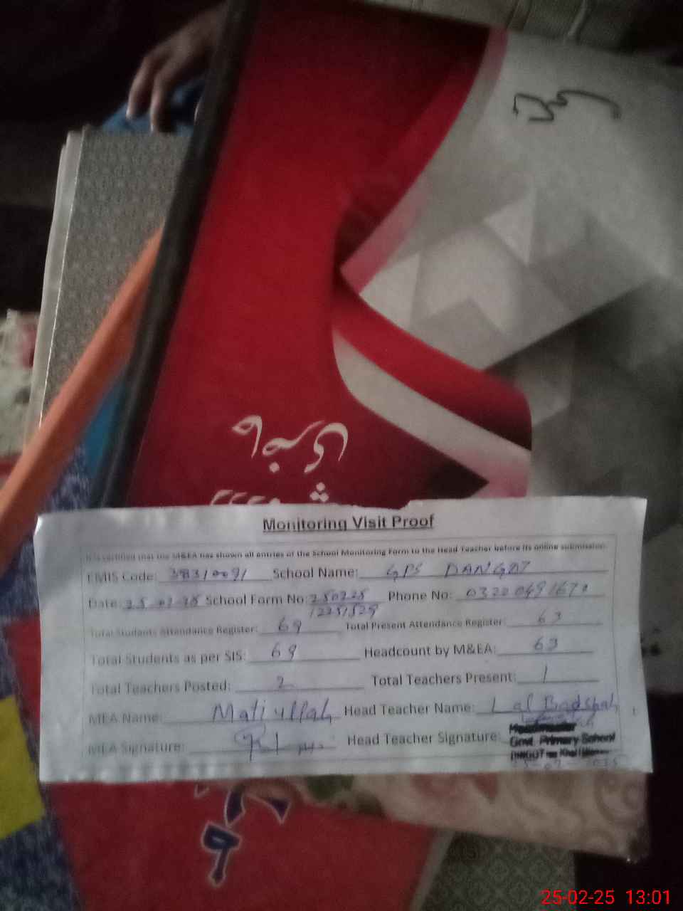 | Attendance Register | Head Teacher | MEA with School | Visit Proof |