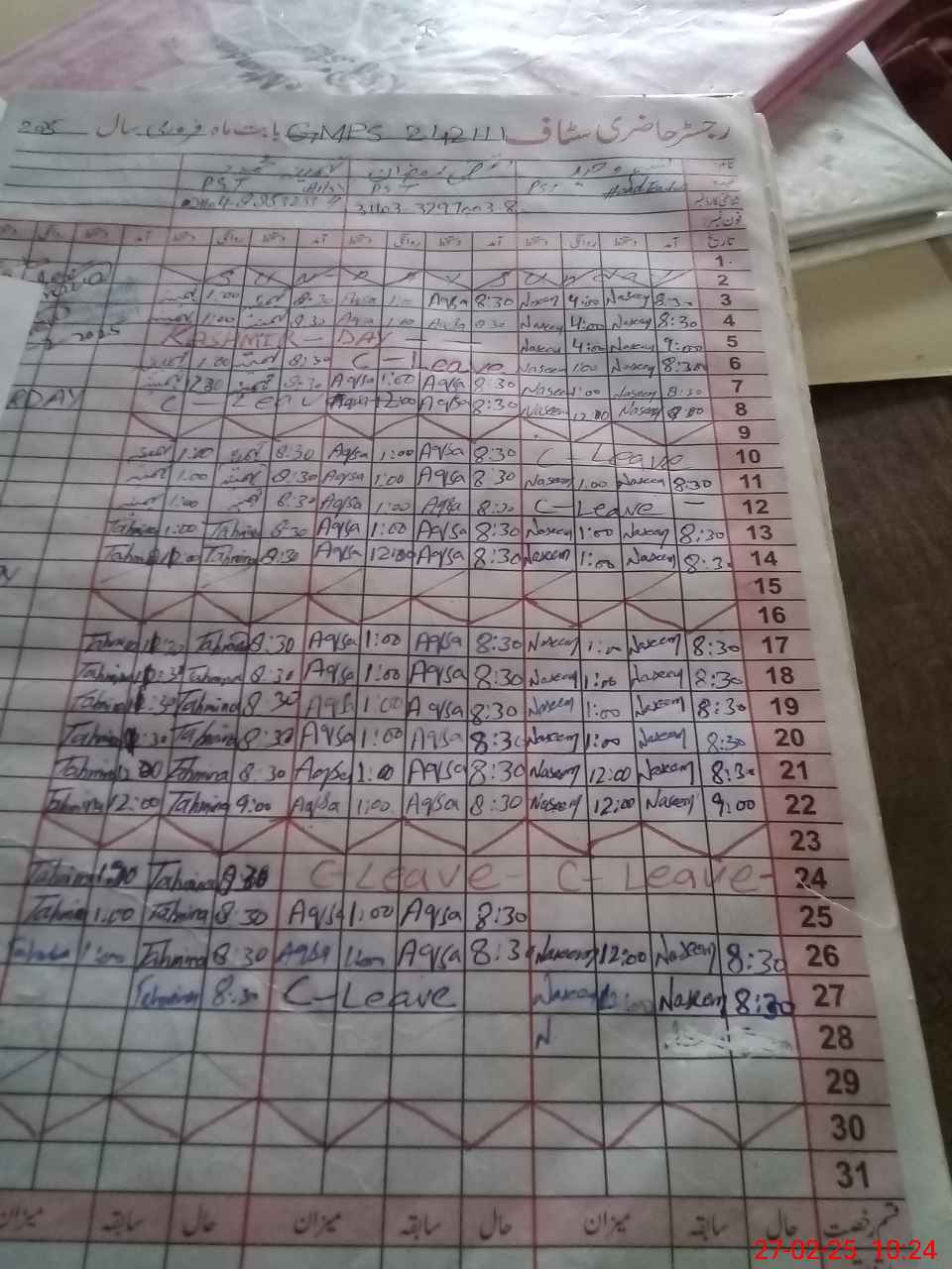 | Leave | Duty | Absent | Maternity | Medical | Ex- Pak |