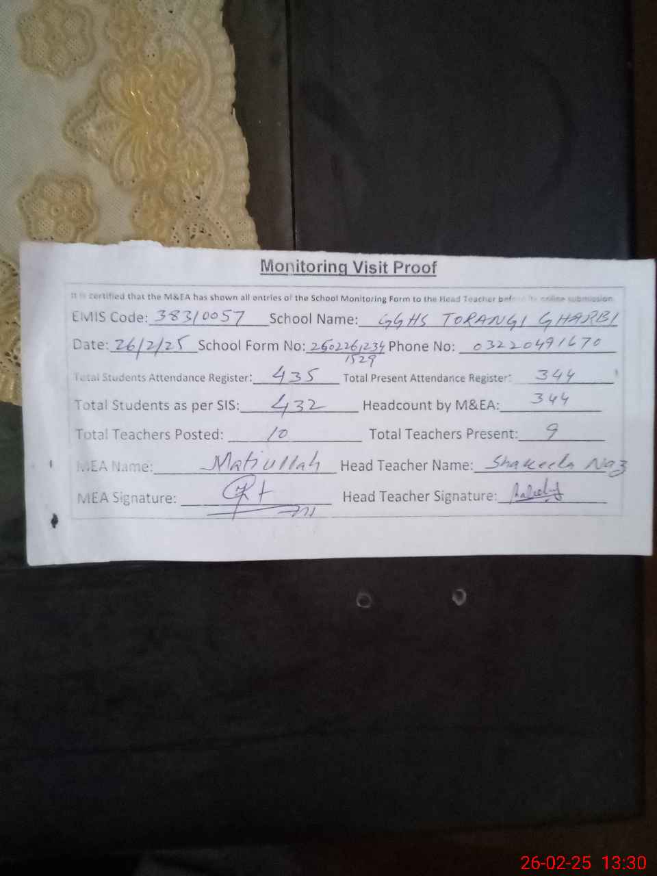 | Attendance Register | Head Teacher | MEA with School | Visit Proof |
