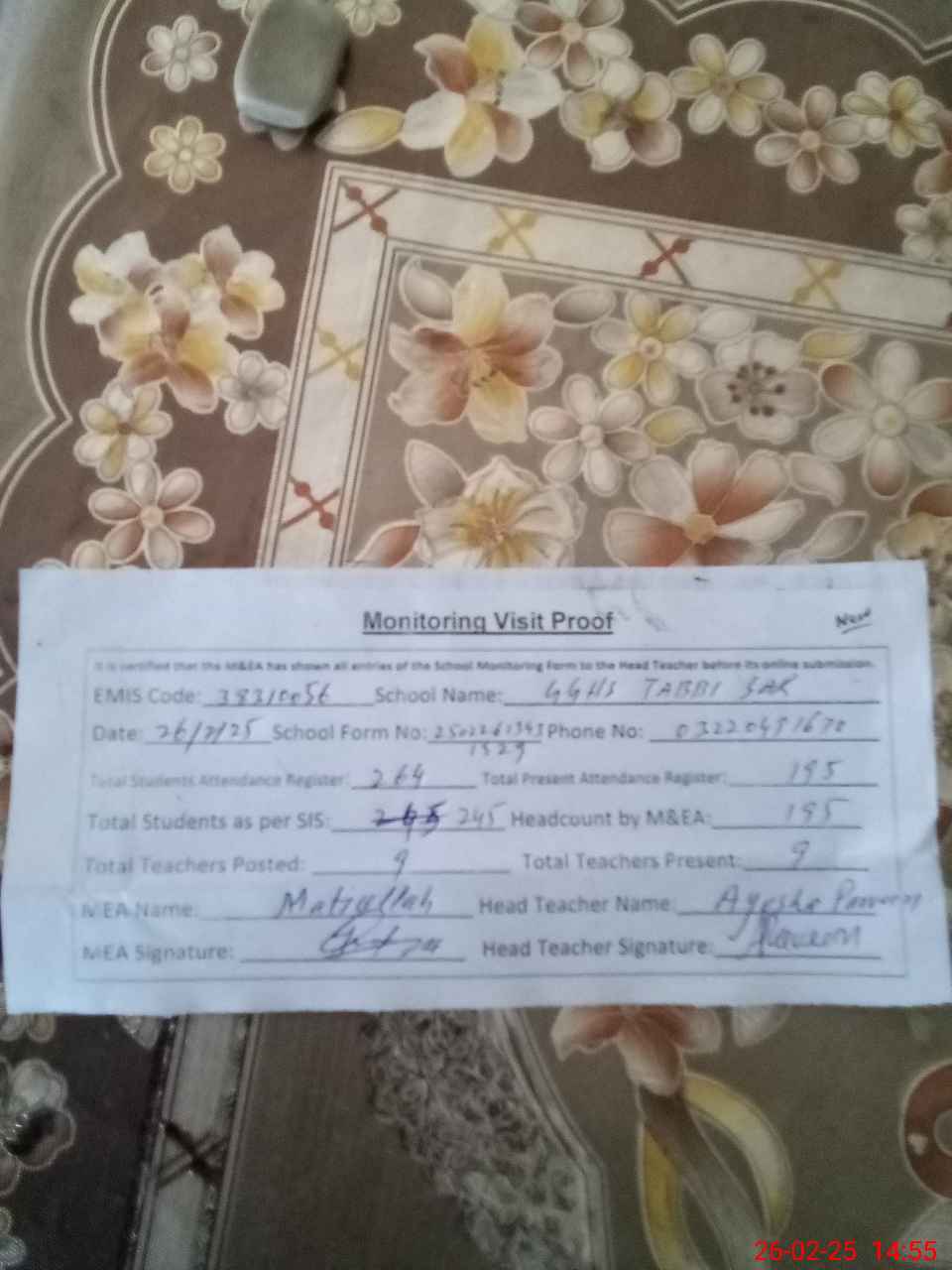 | Attendance Register | Head Teacher | MEA with School | Visit Proof |