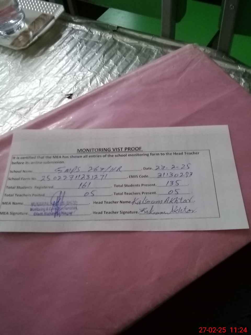 | EMIS Code: 31130293 | Name of School: GMPS CHAK NO 267 HR | |||